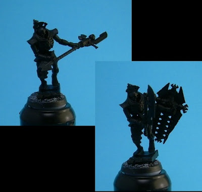 Según las reglas tiene dos opciones de armamento distintas, o un Dáculus -anda, que no había otro nombrecito- o Espada Hiperleches y Escudo. Yo he optado por hacer el experimento de los imanes, y así poder cambiarles de arma y que representen los que llevan.